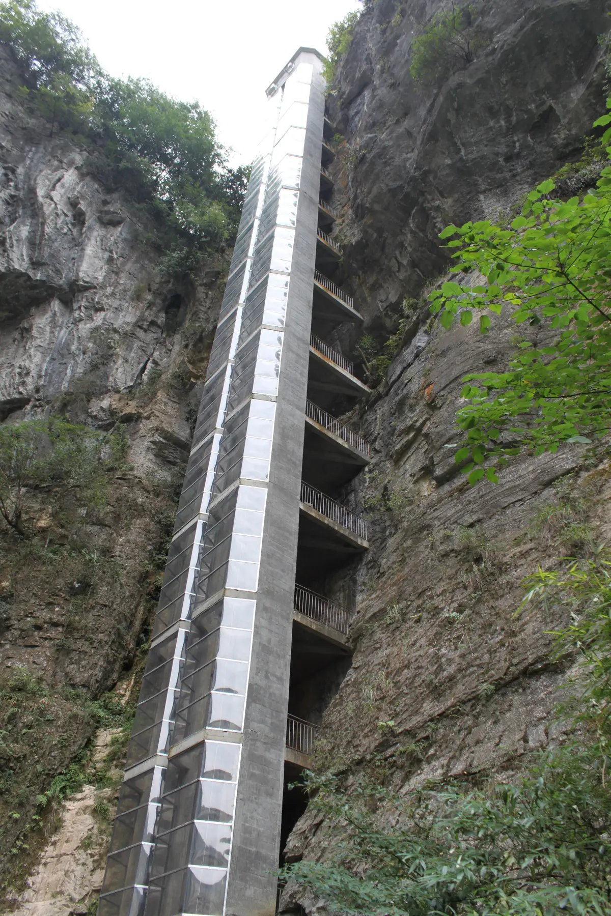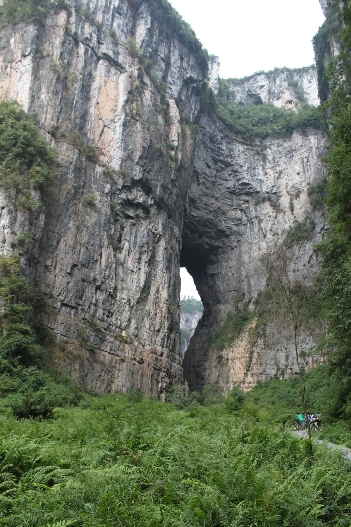 A karst is a natural landscape feature that results when water cuts through soft rock over time, leaving behind canyons full of incredible rock features. Visitors first enter the Three Natural Bridges canyon area, one of the three main attractions of the Wulong Karst, by descending in a multi-story glass elevator and then continuing down a natural rock staircase that passes underneath the first of the three bridges, the Sky Dragon Bridge.