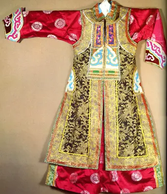 When traveling in the northeastern grasslands of China, you often run across Mongols dressed in colorful costumes and adornments. The effect is quite impressive, especially when you watch a group of Mongolian horsemen thunder past on their mounts, their robes flowing behind them. From a distance, these robes might appear savage and rough-hewn. Upon closer inspection, however, you will probably be amazed by the exquisite workmanship and complicated stitchery.