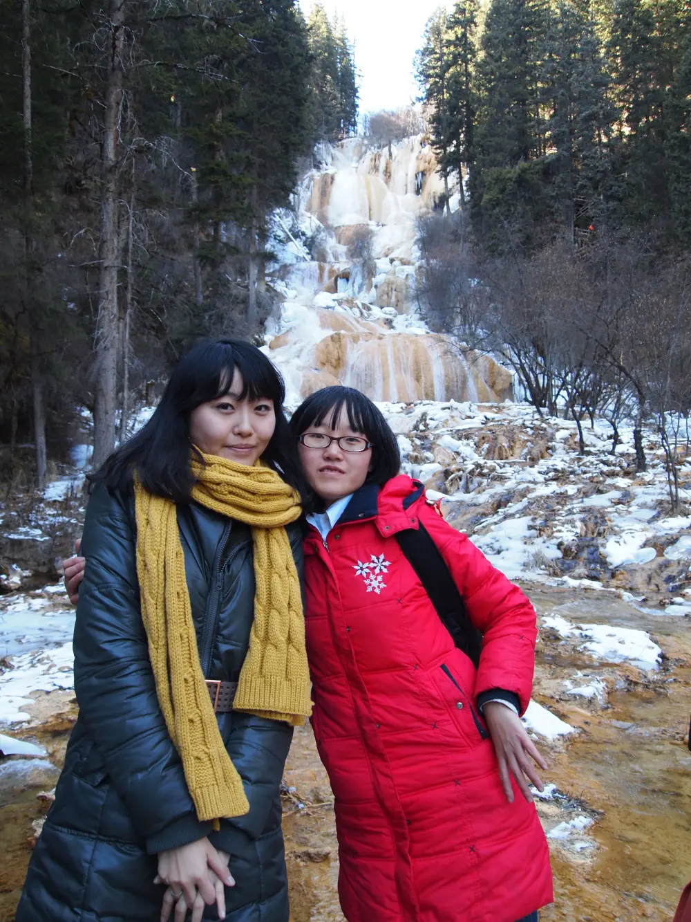 Sadly, when we arrived at Huanglong Park, we found that it was closed because of too much snowfall, so we opted to press on to Zhaga waterfall in Mounigou Valley instead. The area around the waterfall offered a delightful array of pools of different sizes and shapes. Here, for the first time in my life, I saw a waterfall in the heart of winter – shrouded in snow, surrounded by frost-covered ever-green trees, with flows of ice apparently frozen in time as they cascaded down the falls. The frozen Zhaga waterfall, the largest travertine waterfall in China, looked like one of Harbin’s amazing ice sculptures rather than a natural water feature, truly amazing.