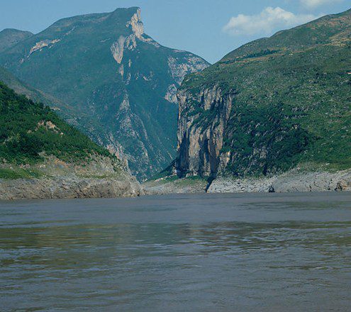 Qutang Gorge: — Qutang Gorge is 8 km. (about 5 mi.) long, the shortest but the grandest and most precipitous gorge among the three gorges. Steep cliffs are towering over the sky, while the width of river is no more than 200 m. (656 ft.), the rapids are surging into the narrow river, winding its way into the deep valley, when you are on the ship, close enough to feeling of the majestic cliffs on both sides, hearing clearly the roaring and turbulent rapids, looking up the sky between the cliffs, you’ll see all the sky is a blue line and get a thrilling feeling.