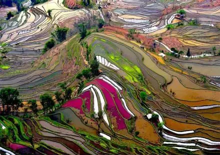 As one of the most wonderful places to visit in China, Yuan Yang is showing its charm to tourists for its spectacular rice-paddy terrace. Hani people cultivated their land in a fantastic and perfect art. They integrated the terraced fields into a unique landform, forests and plant covers, valleys, streams and other natural landscapes. The rice field terrace in Yunnan China is a unique masterpiece of ethnic art that naturally fused the ethnical art, landscape art and agricultural technique. Yuan Yang people left the forever cultural relic for Chinese people, which has been on its function till today. Just like the Dujiangyan Irrigation System in Sichuan, bringing many benefits for future generations. The unique cultivating scene presents a beautiful watercolor painting art work.