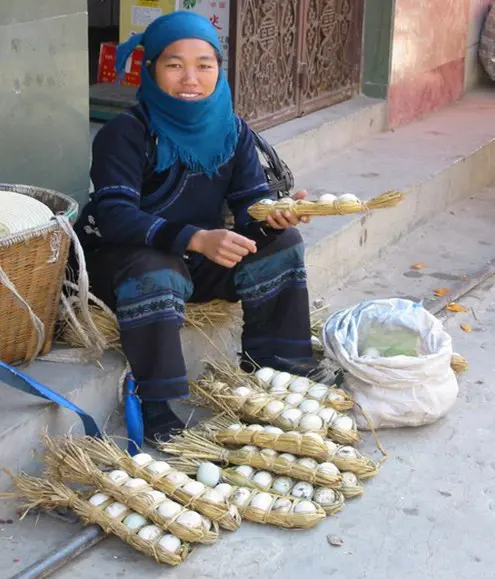 Oddity 1: Eggs are sold in bundles. Much of Yunnan is rural and agrarian, as well as precipitously mountainous, so the locals have come up with a unique way to safely transport eggs to market – they tie up a half-dozen eggs in long padded bundles of rice straw or vegetation strips.