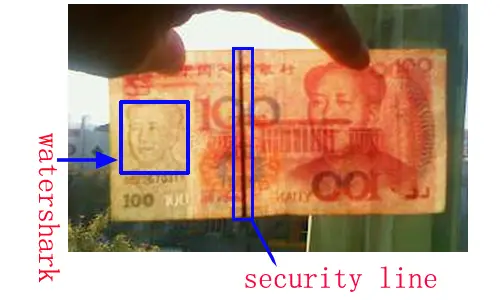 - The third way is to see the security line on RMB, which is a line in the left side. Against the light, you can see “RMB 100” or “RMB 50” on the line in real bank note.
