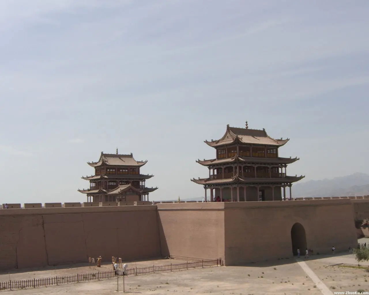 There are two gates: the east and the west, both protected by their own small guard towers. The tower defending the west gate is called Luo City and has a hanging plaque that reads “Jiayu Pass” on its lintel.