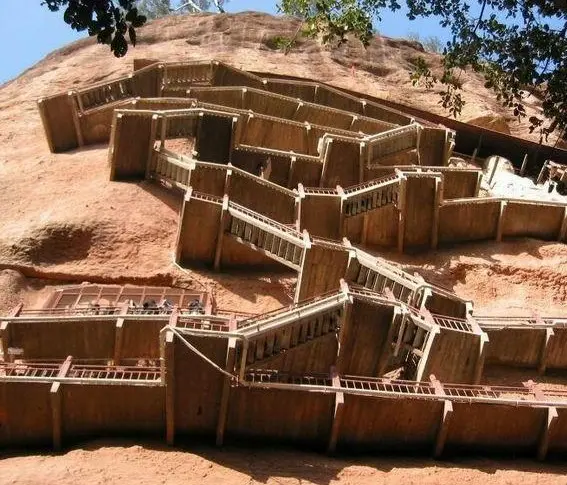 You enter those caves by climbing up the twisted flights of stair hanging on the side of mountain.