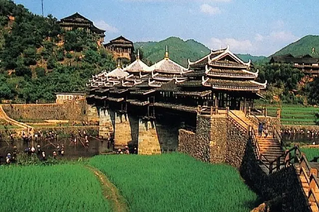 Morning drive to Sanjiang, where you will visit the famous Chengyang Wind and Rain Bridge in Sanjiang, a stunning architectural masterpiece blending traditional Chinese elements into one structure. Built in 1916, this unique footbridge combines elements of a painting, bridge, corridor, veranda, and pavilion, all crafted from stone, wood, and tile. It's a remarkable example of old-fashioned Chinese construction that continues to captivate visitors.