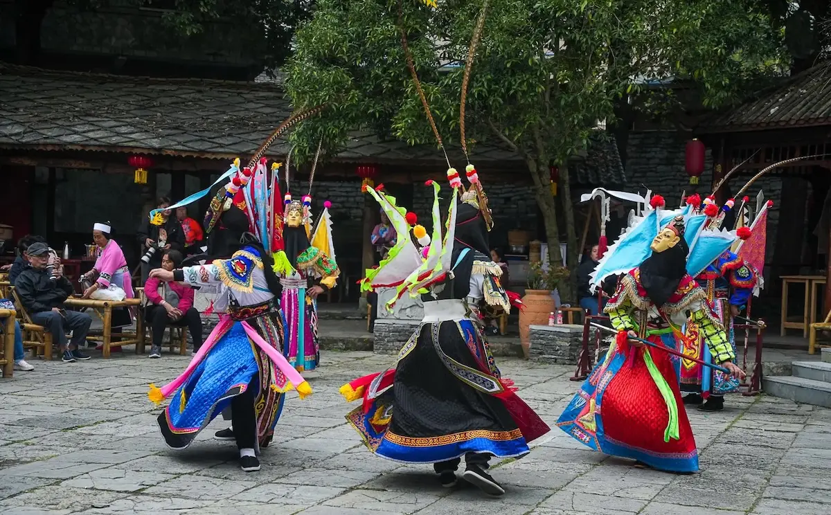 On the way, stop at Tianlong Tunbao, a well-preserved Ming dynasty military settlement. This unique village preserves the ancient lifestyle, culture, and traditions of the Ming dynasty, which have been maintained for centuries. Locals still wear traditional Ming-style costumes, speak the Tunbao dialect, and uphold ancient customs. A highlight of your visit is the Ground Opera (Dixi), one of the oldest operas in China. Performed to tell stories, offer sacrifices, and entertain, Dixi Opera is a cultural treasure left by the Tunbao people and provides a fascinating glimpse into their heritage.