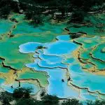 Huanglong Park, also a World Natural Heritage Site since December 1992, is situated at an elevation of approximately 3,000 meters (9,840 ft). It is famous for its multicolored lakes. These lakes, with their various shapes and sizes, exhibit dreamlike hues of yellow, blue, green, and brown. These vibrant colors are a result of the natural minerals in the water and the way sunlight interacts with the water's surface. Surrounding the colorful lakes are pristine forests and magnificent snow-capped mountains.