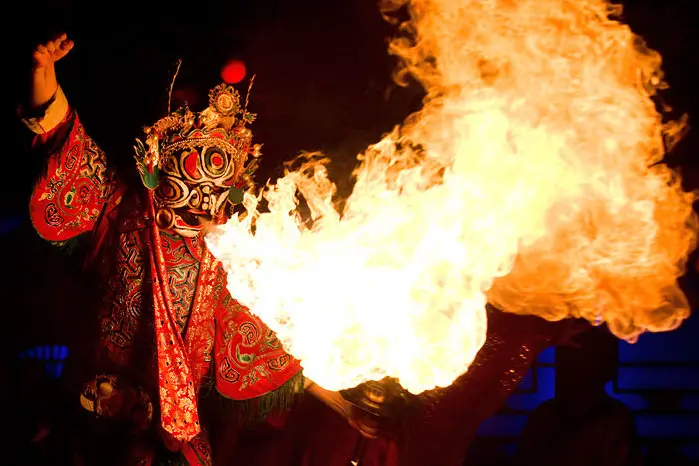 Fire breathing show in Sichuan Opera is unique as compared to other such performances. Artists have combined Chinese mask changing with fire breathing, which is super difficult and dangerous to do.