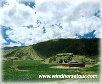 A tomb near the north bank of Chonggye River is said to be the tomb of Songtsen Gamp, who set up the first unified regime in Tibet. This splendid tomb stands 13.4 meters (about 44 feet) high. On the top, there is a temple for worship in which the statues of Songtsen Gampo, his two wives (Princess Wen Cheng and Princess Chi Zu), and his ministers are displayed. The gate of the tomb opens to the west, the direction of Sakyamuni’s homeland, demonstrating the king’s piety to Buddhism. According to descriptive records, the inner tomb (about 100 meters square) (about 109 yards) consists of five halls, the middle hall being the one in which the remains of Songtsen Gampo and his two wives were laid. It is believed that the statues of Songtsen Gampo, Sakyamuni, and Avalokitesvara are in the tomb. The tomb also contains a large number of gold and silver utensils, reliquary, and commemorative artifacts.