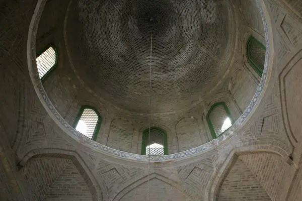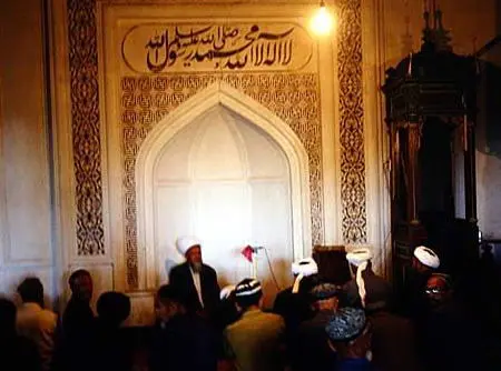 Covering an area of 1,165 sq. m, Kuqa Great Mosque is composed of two parts: the main body and a prayer hall. The prayer hall is large enough to hold as many as 3,000 persons. The Mosque is a unique I slamic style building with a door built by green tiles and a dome on the top. What is spectacular about the structure of the Mosque is the 64 prism-shaped pillars propping up the coffered ceiling which is decorated by intricate patterns.