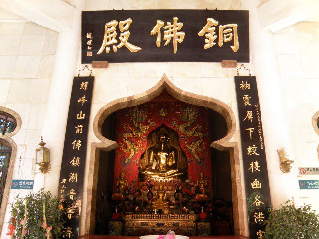The main temple perfectly combined the octagonal pavilions, Golden palace with the mountains, water and the garden architectural style in Jiangnan, which is rarely found in other temples. There is a copper Buddha palace and a copper statue of Sakyamuni in the temple, which is the only Buddhism Hall in the inner land of China. The Sakyamuni is 3.5 m high, weights 4 tons and it is featured by its vivid expression and grandness. Looking from a far distance, we can see the magnificent temple, solemn Buddha, unique pavilions and verdant forests bonding well with each other, which leaves this temple a grand sight.