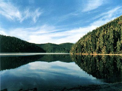 The Bitahai Lake is also featured by the surrounding beautiful scenic spots with flourish spruce and azalea forests standing around the lake. The azalea flowers are always in full bloom but when it comes to May, the withered flowers will fall to the lake. Tourists can get the sight of fallen azalea flowers afloat on the water and eaten by fish while amusing themselves. However, after their eating, they will get drunk and float on the surface with their abdomen facing the sky. Because this is a unspoilt land, there has lived many precious water lives which is of high value for research. The most shocking thing is that there lived one fish having three lips!