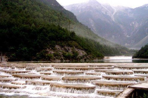 The White Water Terrace is a famous scenic spots located at the foothill of the Haba Snow Mountain and 103 km. (64 mi.) away from the Shangri-la County in Yunnan Province. It is well known for its peculiar landform with a history of 2,000 to 3, 000 years, being regarded as one of the birth place of Nakhi Dongba culture.