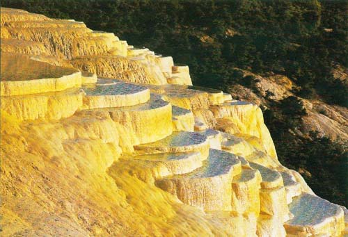 Looked from a far distance, the White Water Terrace likes layers of white terrace fields set in the green mountain with an altitude of 2,380 m. (7,808 ft.). The top of the terrace is featured by a semicircular platform pool and the stream water comes out of the top of the mountain and flows downward. When the stream water reaches the edge of one shallow basin, it silently trickles into another, leaving delicate tracks and beautiful sight for the whole area. When the terrace is in the sunshine, it appears to be a grand waterfall which make it stands out among many other attractions.