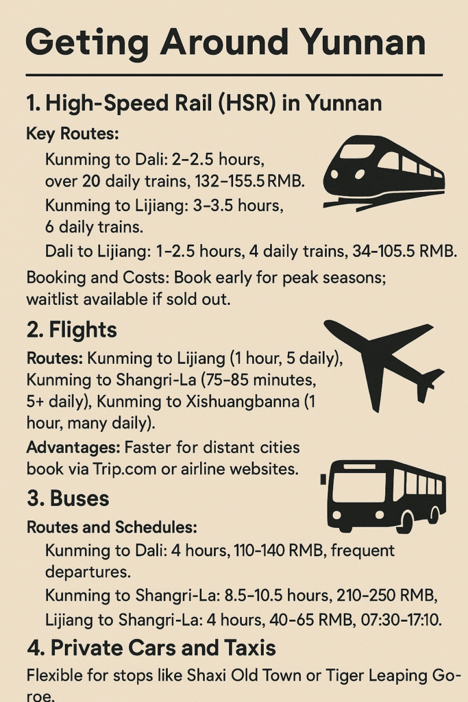 Because of its size and geography, Yunnan transportation requires careful planning. Cities and attractions are often far apart, and the roads may wind through mountains or remote areas. Therefore, understanding your transportation options ahead of time is crucial. Whether you plan to use high-speed trains, flights, or buses, a clear travel plan will help you make the most of your trip and enjoy all that Yunnan has to offer.